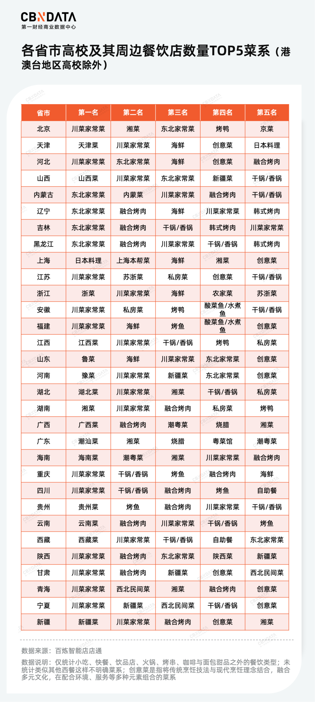 值得注意的是,除了各地皆宜的品类,地域特色在高校周边餐饮中同样显著,不同地区的学生也对本地特色菜“情有独钟”。从北到南,从东到西,超过八成的省市高校周边餐饮店铺中,本地特色菜系占据了店铺数量的前五位,学校店与本地饮食文化一脉相承。