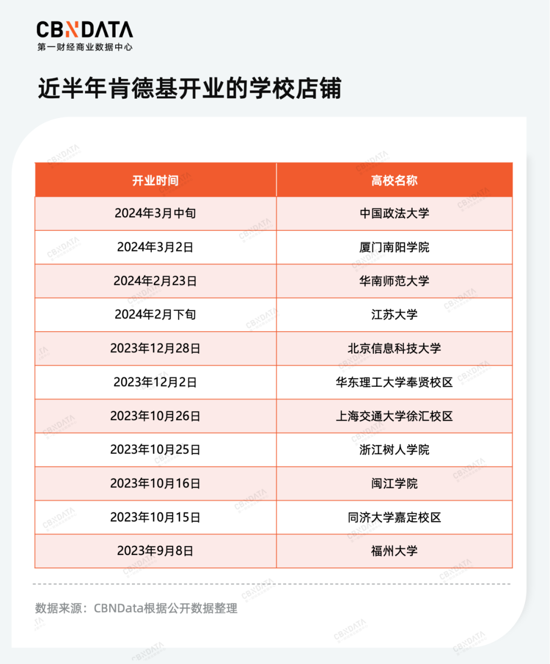 当咖啡品牌将高校视为重要拓展一环时,高校早已是连锁快餐品牌的“隐形战场”。实际上,麦当劳早在2013年便在华中科技大学开设了其首家校园店。经过十年的发展,麦当劳已在全国高校中设立了逾60家门店。肯德基亦不甘落后,在2019年推出了全国首家教学餐厅后,北京和四川的首家校园店也相继开业。根据CBNData的不完全统计,近半年来,肯德基已经成功进驻了11所高校。
