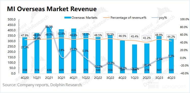 2023 年第四季度小米海外收入 323 亿元,同比增长 5.3%,收入占比 44.2%。