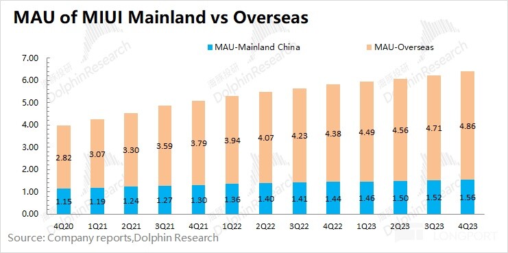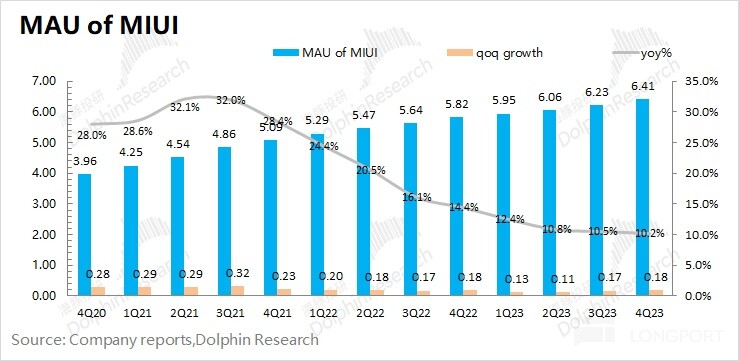 MIUI 用户数:截止到 2023 年 12 月,MIUI 月活跃用户数达到 6.41 亿,同比增长 10.2%,本季度 MIUI 用户增速继续回落,但用户数仍维持着两位数的扩张速度。