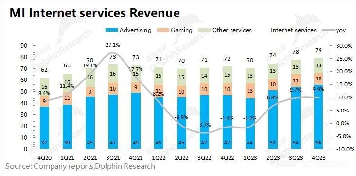 2023 年第四季度小米互联网服务业务实现营收 79 亿元,同比增长 9.9%,在公司总营收占比 10.8%。