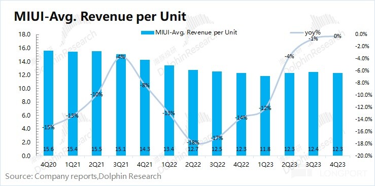 价:2023 年第四季度小米智能手机出货均价 1092 元,同比下滑 2.6%。