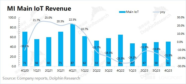 2023 年第四季度小米 IoT 业务实现营收 203 亿元,同比下滑 5.1%。IoT 业务本季度的下滑,主要是受智能电视和笔记本收入减少的影响。