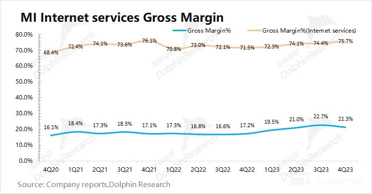 2023 年第四季度小米互联网服务业务毛利 59.7 亿元,同比增长 16.3%。本季度互联网毛利率同比上升 4.2pct,主要由于本季度公司的广告业务占比提升所致。