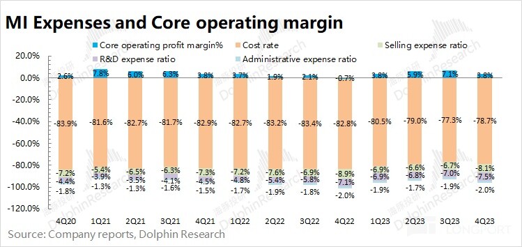 2023 年第四季度小米三项费用合计 128.6 亿元,同比增加 8.5 %。公司本季度费用端的增加,主要来自于销售费用和研发费用。