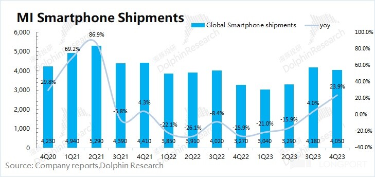 量:2023 年第四季度小米智能手机出货量 4050 万台,同比增长 23.9%。