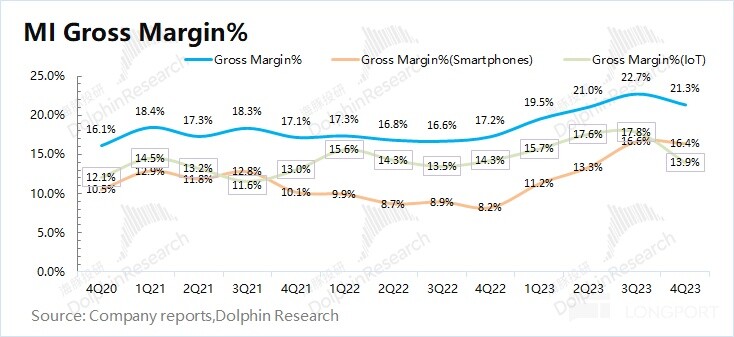 小米集团 2023 年第四季度毛利率 21.3%,同比上升 4.1pct,基本符合市场预期(21.4%)。