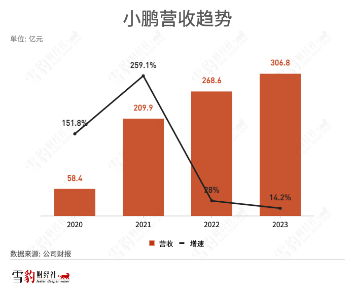 财务方面,小鹏在去年仍未走出增收不增利的泥潭。2023年,小鹏累计营收为306.8亿元,同比增长14.2%,增速创上市以来的新低。