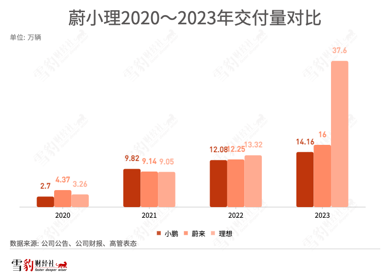 2023年,小鹏累计交付14.16万辆汽车,同比增长17%,只完成了年度销量目标的70.8%,交付量和增速均在蔚小理中陪居末席。