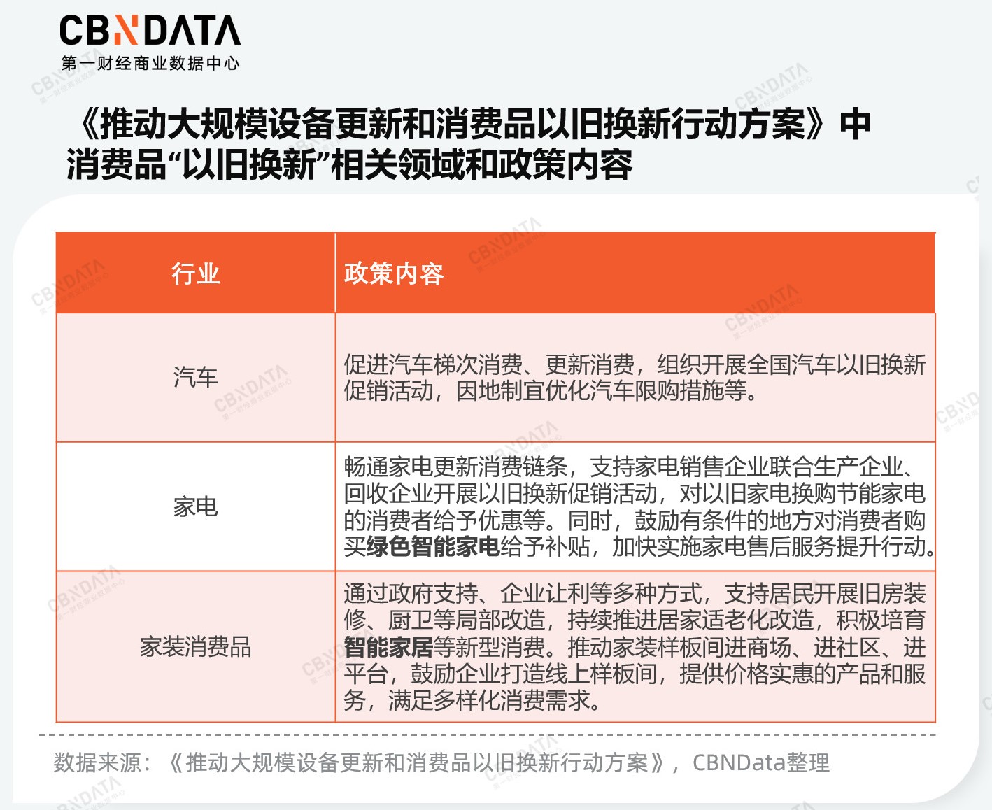 随着政策基调的明确,更细致的工作部署也随之出台。3月13日,《推动大规模设备更新和消费品以旧换新行动方案》(以下简称“行动方案”)正式对外发布,主要涉及的消费品领域包括汽车、家电和家装三大行业。从市场空间来看,截至2023年底,我国民用汽车保有量达到3.36亿辆,冰箱、洗衣机、空调等主要家电品类保有量超过30亿台,预计耐用消费品的“以旧换新”将为市场带来数万亿的增长潜力。从政策导向来看,今年“以旧换新”特别强调满足居民对绿色、智能、高端产品的新需求,旨在为市场注入新的增长动力,这对于上游制造业发展新质生产力也产生了积极的拉动效应。