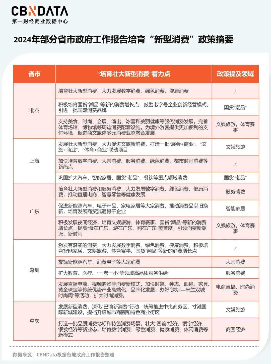 今年两会期间,培育“新型消费”也成为各级政府关注的重点。据CBNData统计,截至目前,绝大多数地方政府工作报告均对2024年培育新型消费工作目标及重点任务作出安排部署,我们选取了部分省市政策内容进行了整理: