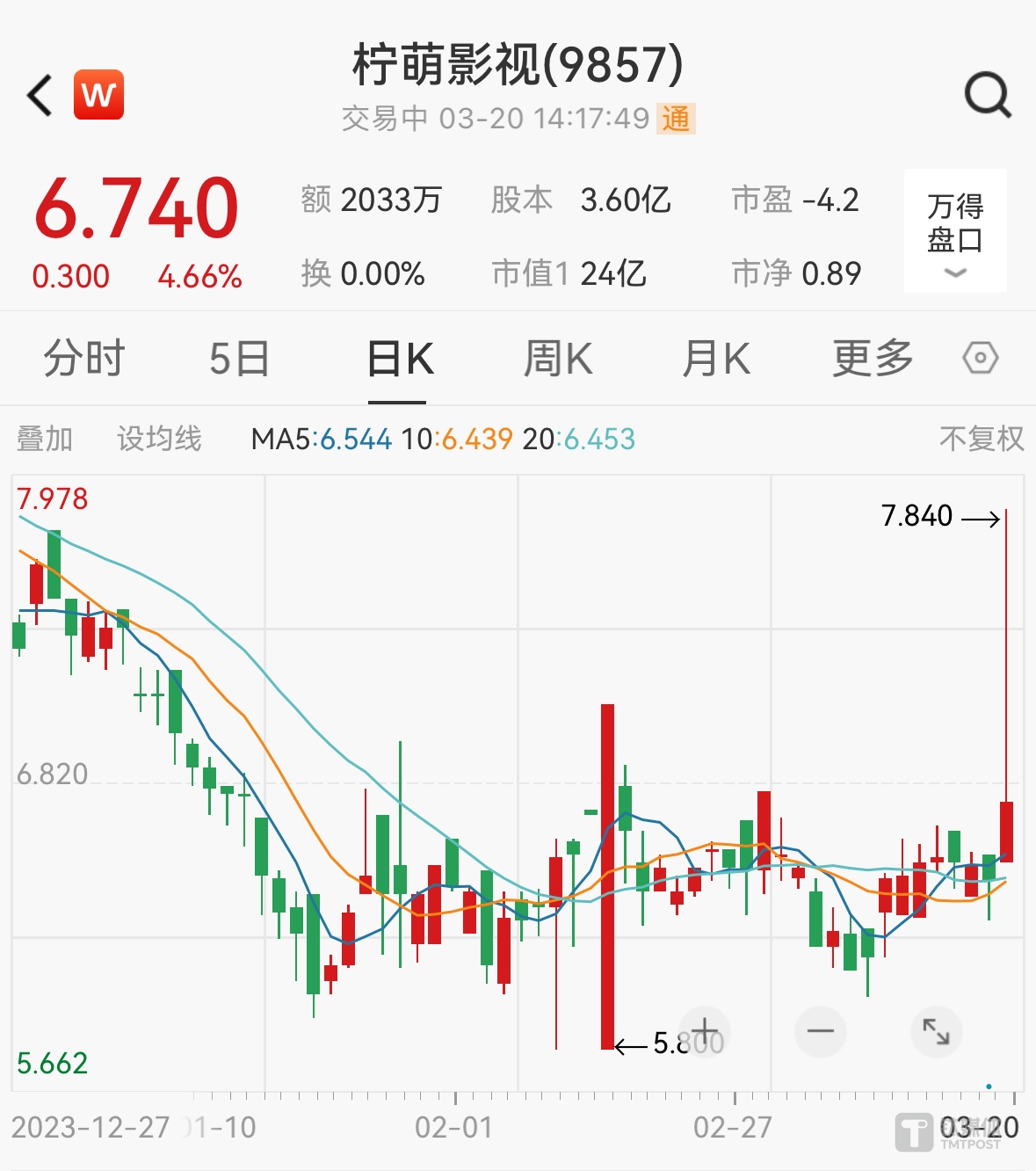 3月20日开盘10分钟后,柠萌影视股价快速涨超21%,报7.84港元,为开年以来的最高价。而后开始回落,截至发稿前市,柠萌影视股价报6.74港元,涨4.66%,公司总市值约24.29亿港元。