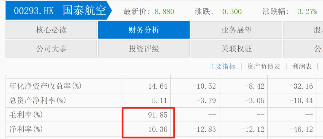 众所周知,茅台的毛利率是很多行业的天花板,毛利率能高过茅台的少之又少,而国泰航空算是不多中的一家。