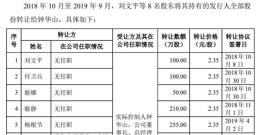 有朋友留在了公司,也有朋友选择套现离场。2018年10月-2019年4月,钟华山的5位朋友将所持全部715万股份转让钟华山,转让价格为2.35元/股,套现超1600万元。