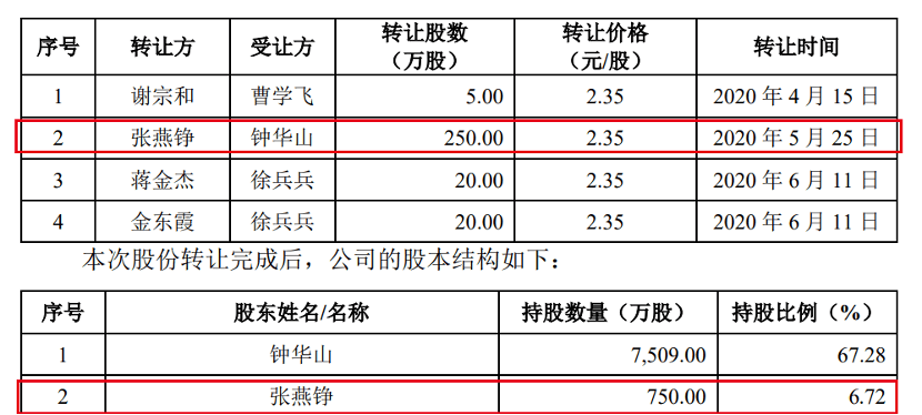 2020年5月,张燕铮向钟华山转让了250万股公司股份,每股单价2.35元,套现超500万元。转让完毕之后,张燕铮仍持有公司6.72%股份。