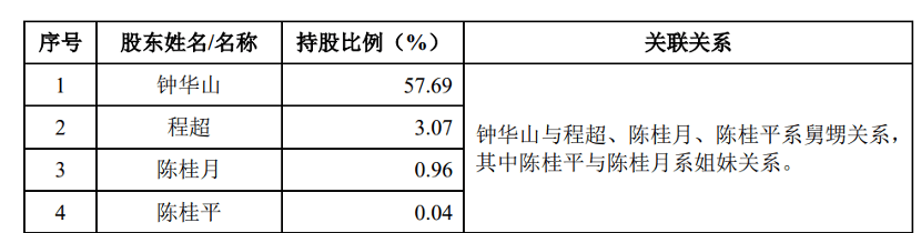 不过,钟华山也没有忘记家里人。招股书显示,钟华山与公司股东程超、陈桂月、陈桂平系舅甥关系。其中,程超还在公司任职董事、副总经理兼董事会秘书,陈桂月则是公司董事。