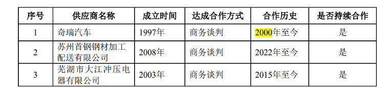 在2021年,公司还向奇瑞汽车采购了2555.84万元块料、零部件等产品,奇瑞汽车也一跃成为了公司前五大供应商之一。