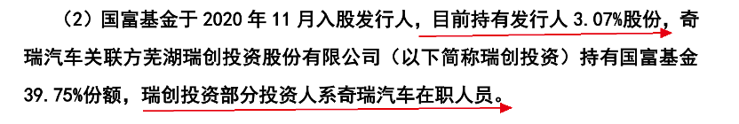 据悉,奇瑞汽车关联方瑞创投资持有国富基金39.75%份额,瑞创投资部分投资人系奇瑞汽车在职人员。其中,奇瑞控股、奇瑞股份董事长兼总经理尹同跃,奇瑞控股常务副总经理李从山,奇瑞股份副总经理高新华赫然在列。