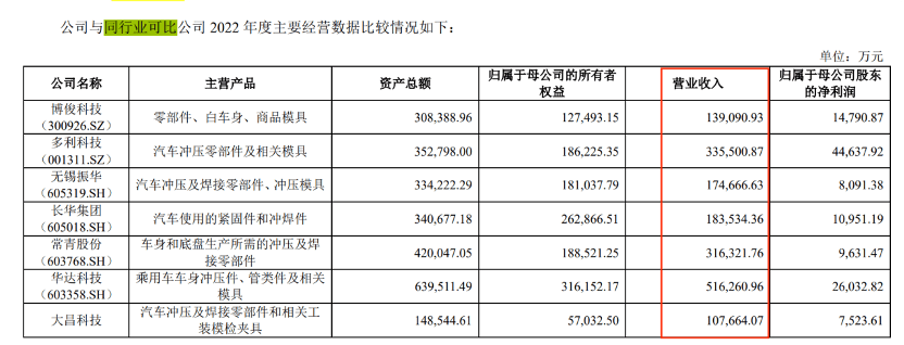 以2022年经营数据为例,同行业可比公司博俊科技、多利科技、无锡振华、长华集团、常青股份和华达科技在2022年的营收位于13亿元至52亿元之间,而大昌科技尚不到11亿元。