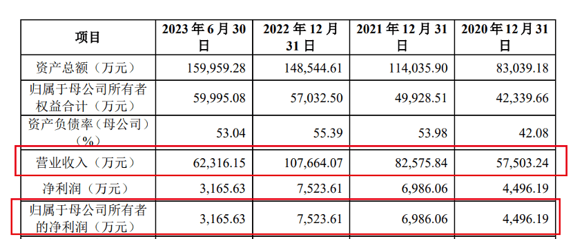 招股书显示,2020年-2023年6月,公司的营业收入分别为5.75亿元、8.26亿元、10.77亿元和6.23亿元;归母净利润4496.19万元、6986.06万元、7523.61万元和3165.63万元。