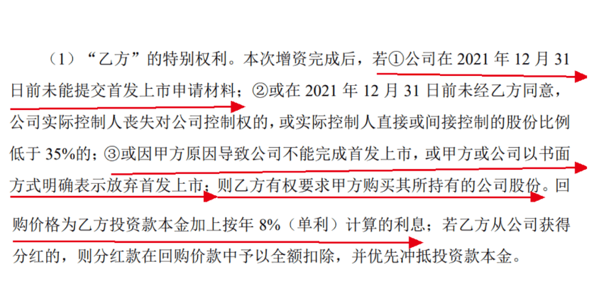 协议约定,若公司在2021年12月31日前未能提交首发上市申请材料,或因钟华山方原因导致公司不能完成首发上市,或钟华山或公司以书面方式明确表示放弃首发上市,则上述投资者有权要求钟华山购买其所持有的公司股份,回购价格为投资者的投资款本金加上按年8%(单利)计算的利息。