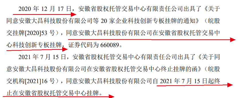 签完对赌协议之后,大昌科技并未直接向A股递交招股书,而是选择在安徽股权托管交易中心挂牌。2020年12月,安徽省股权托管交易中心同意大昌科技在其科技创新专板挂牌。