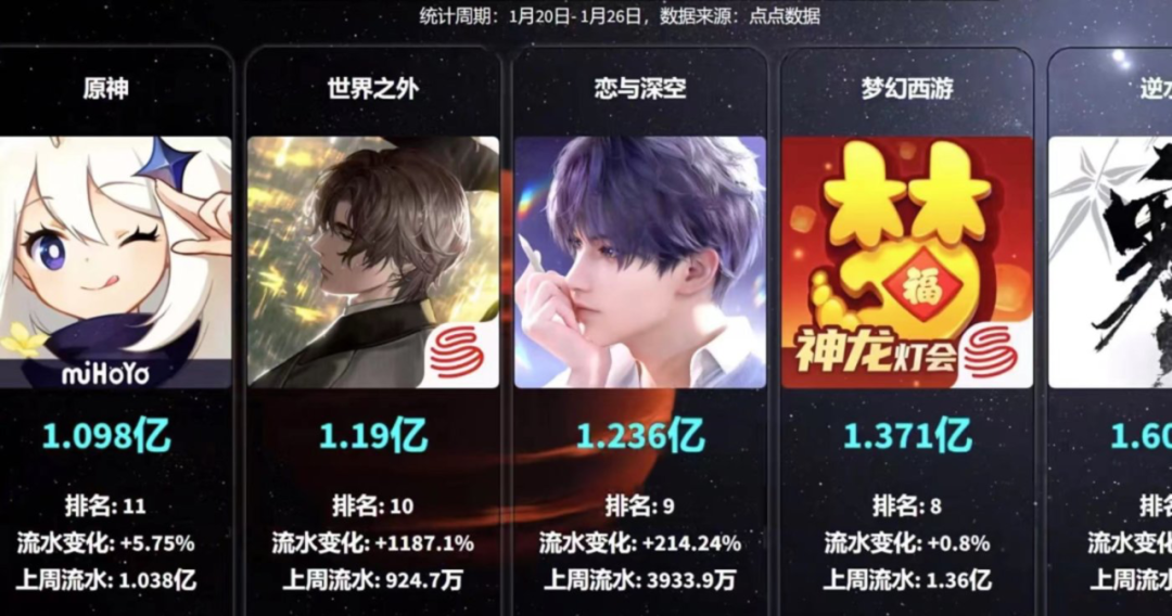 《蛋仔派对》在年轻群体的风靡无需多言,就连今年1月“国乙大战”后,《世界之外》和《恋与深空》也双双成为“大赢家”,两者1月20日-1月26日的流水分别为1.19亿及1.236亿元,超过《原神》。腾讯、米哈游等下场展开大动作后,乙女手游以一种全新样貌闯入市场,游戏板块整体走高。