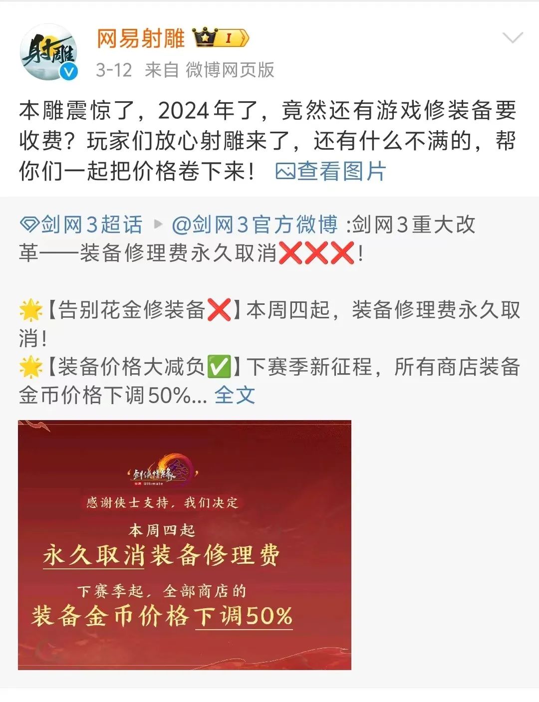 此前1天,西山居旗下《剑网3》官博宣布,要永久取消游戏内的装备修理费,并自下赛季起所有商店装备金币价格下调50%。