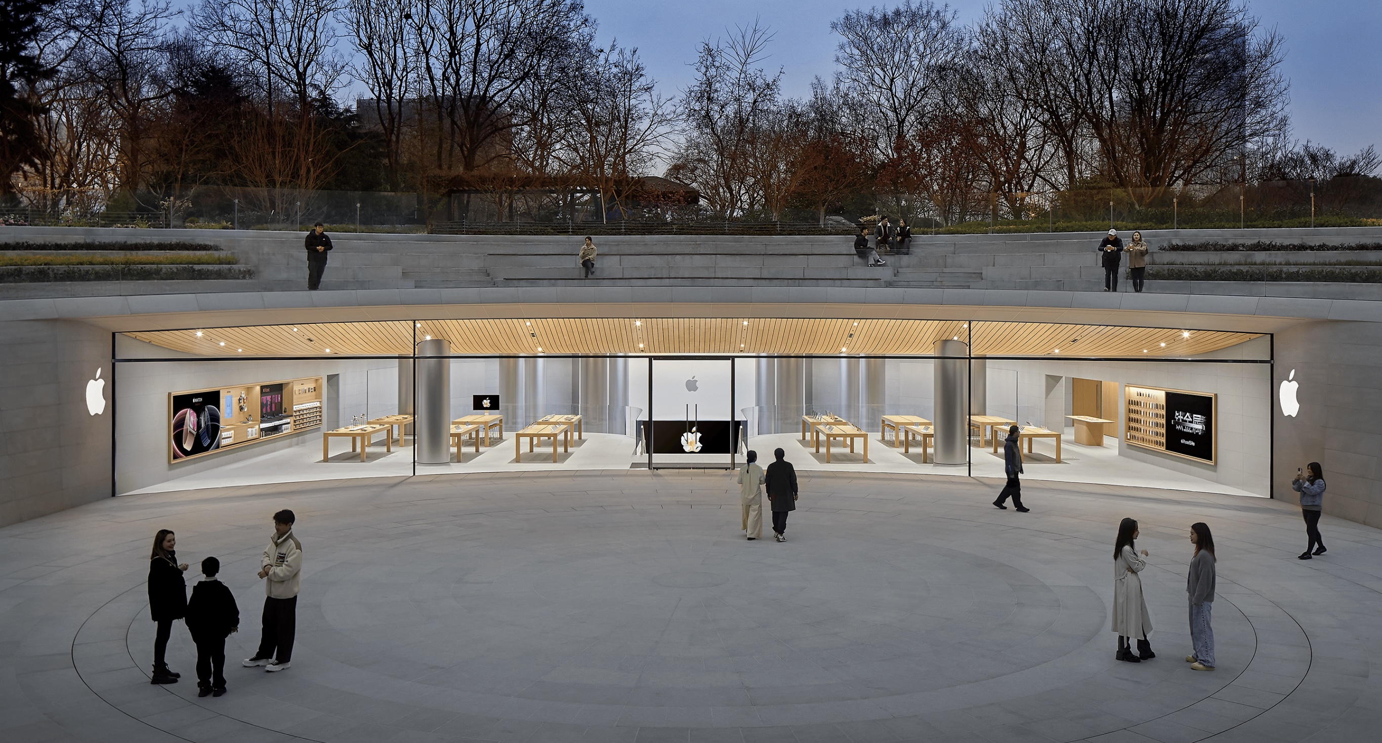 比如在 2024 年 3 月 21 日开业的 Apple 静安,尽管它和 2010 年开业的 Apple 浦东同为下沉广场设计,同时也是目前中国第一大,全球第二大的 Apple Store,但「空荡荡」的广场中心看起来却远不如浦东店那么有标志性。