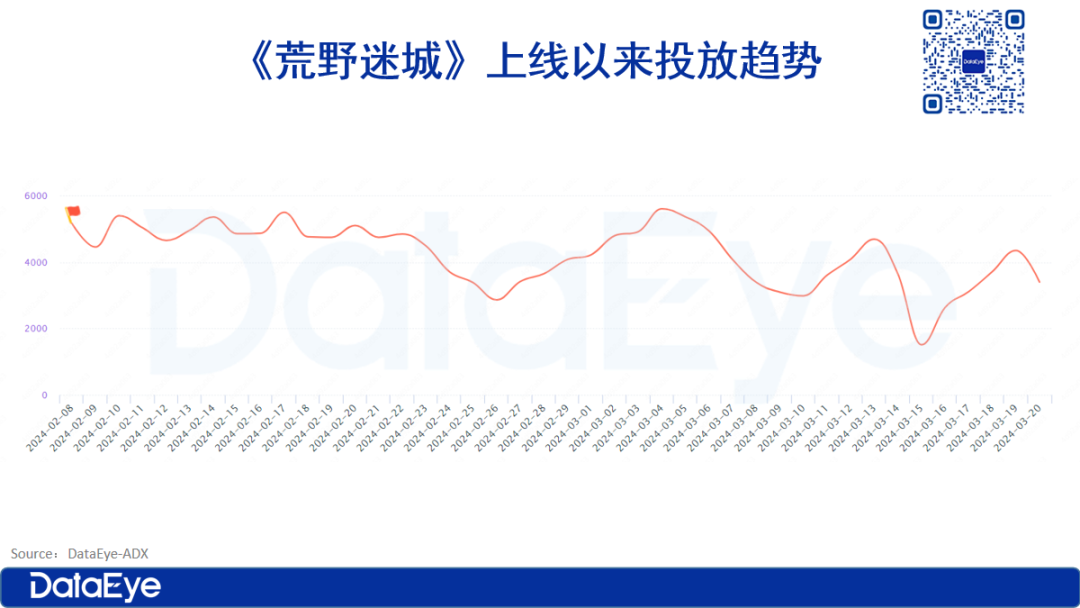 放眼整个赛道,在海外,生存末日题材早已处于竞争白热化的阶段。但在国内,并不是一个大众赛道,容易水土不服。DataEye-ADX数据显示,近一年以来国内这个赛道在投的游戏APP素材趋势如下,在今年2月《荒野迷城》上线以前,日均投放较低,主要投的游戏是《旭日之城》、《末日血战》和《最后一道防线》。《荒野迷城》上线后一己之力撑高赛道投流空间,