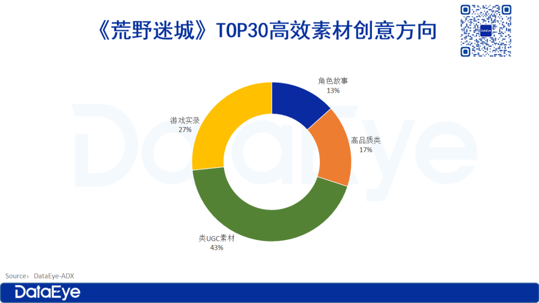 DataEye研究院整理了《荒野迷城》投放计划数TOP30的高效素材,其投放素材创意形式中,类UGC素材占比最高,达43%;其次是游戏实录,占比27%;高品质类和角色故事介绍分别占比17%和13%。
