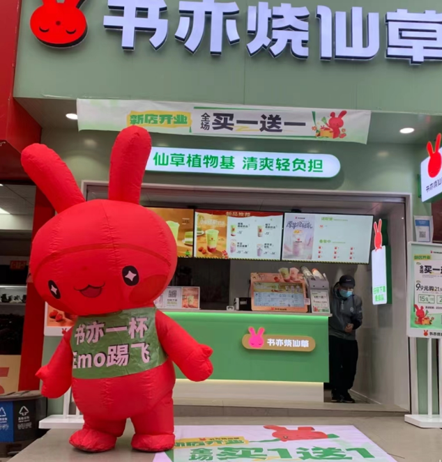 被戏称为“加水八宝粥”的多料时代成为过去,书亦烧仙草也抛弃了“半杯都是料”的口号,卷起健康概念,将目光瞄准了植物基新茶饮的市场,主动颠覆自己过去经营的品牌形象,将“书”字Logo换成了一只红色的小兔子,门头通体换成了绿色。