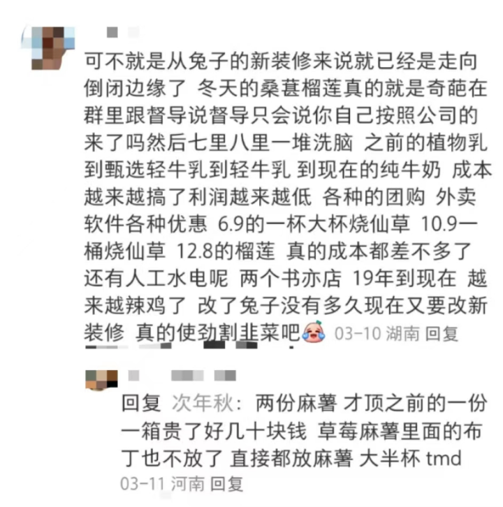 消费者们并不理解书亦烧仙草巨大动作背后的用心,不少顾客以为自己遇到了山寨店,扭头就走,客流量明显下滑。仙兔仙蒂没有收获年轻消费者的好感,反而被吐槽“配色离谱”“土”。已经上船的加盟商们,没有回头路,他们只能穿上红色兔子玩偶服,想尽办法做活动,吸引更多的客人前来。“之前穿着那个玩偶服被小娃儿揍,七八个围着我踢。”“白天上班,晚上当小丑。”