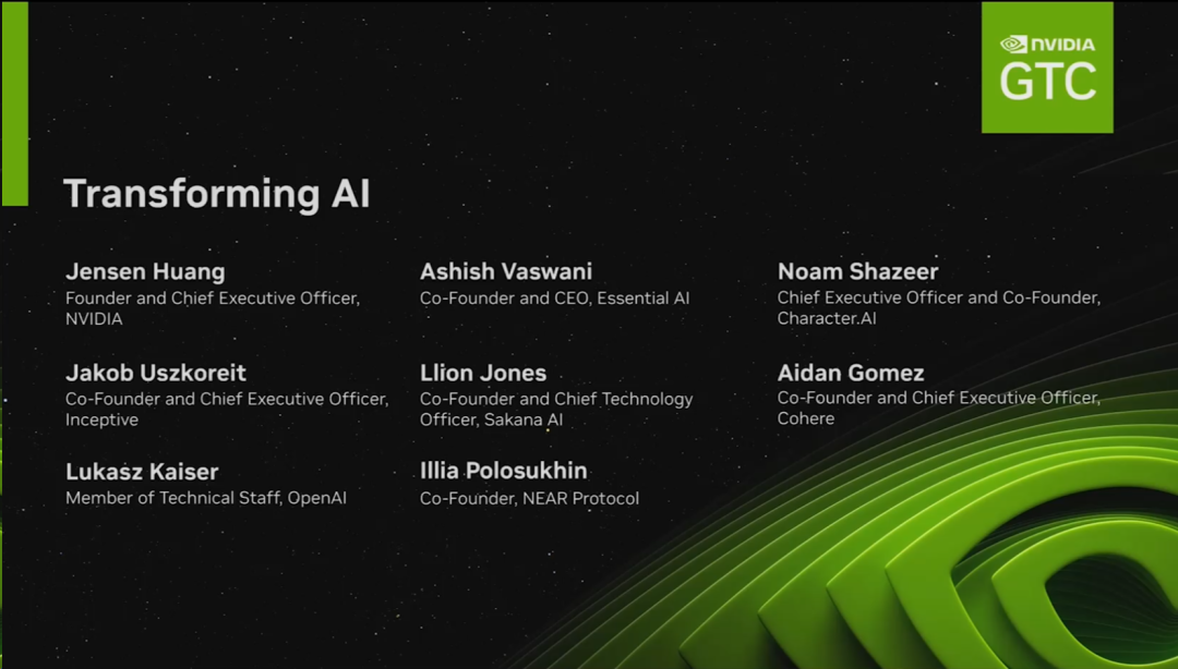 观众如此关注这场圆桌讨论的原因除了黄仁勋之外,还有英伟达预告的重磅嘉宾:Ashish Vaswani、Noam Shazeer、Niki Parmar、Jakob Uszkoreit、Llion Jones、Aidan Gomez、Lukasz Kaiser和Illia Polosukhin。