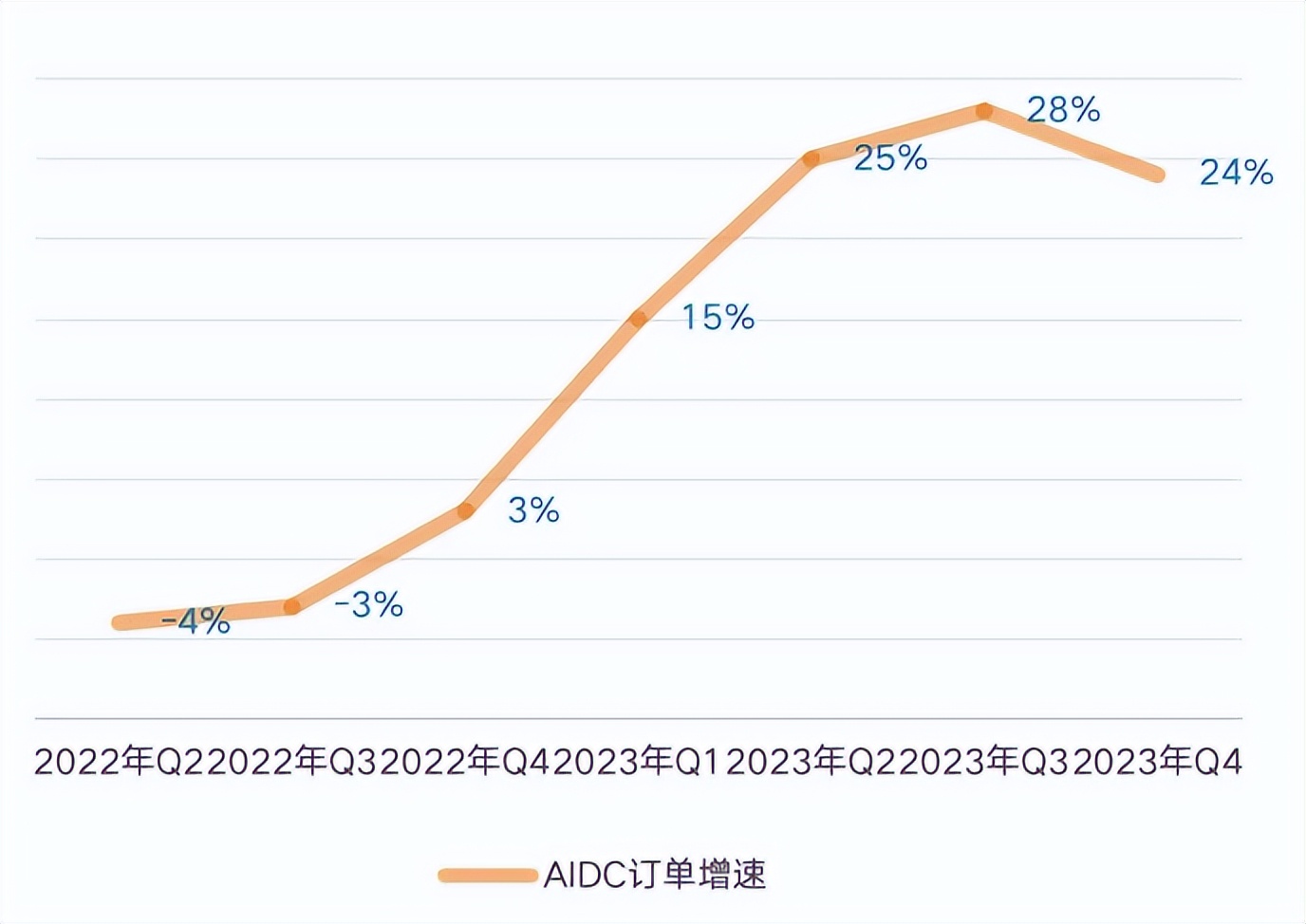 从订单量看,近三个季度,AIDC订单同比增速维持在25%上下,而之前四个季度,订单增速从-4%快速提升至25%。
