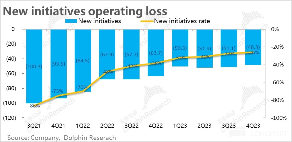 实际新业务本季亏损了 48 亿,市场则是预期亏损会环比持平在 51 亿。因此减亏的进展是略超预期的。本次公告中,公司也官方宣称在 24 年会以收窄亏损为首要目标,算是验证了之前新业务要减亏的传闻。