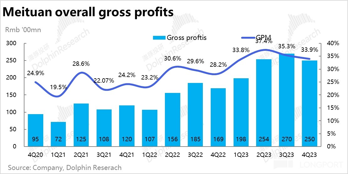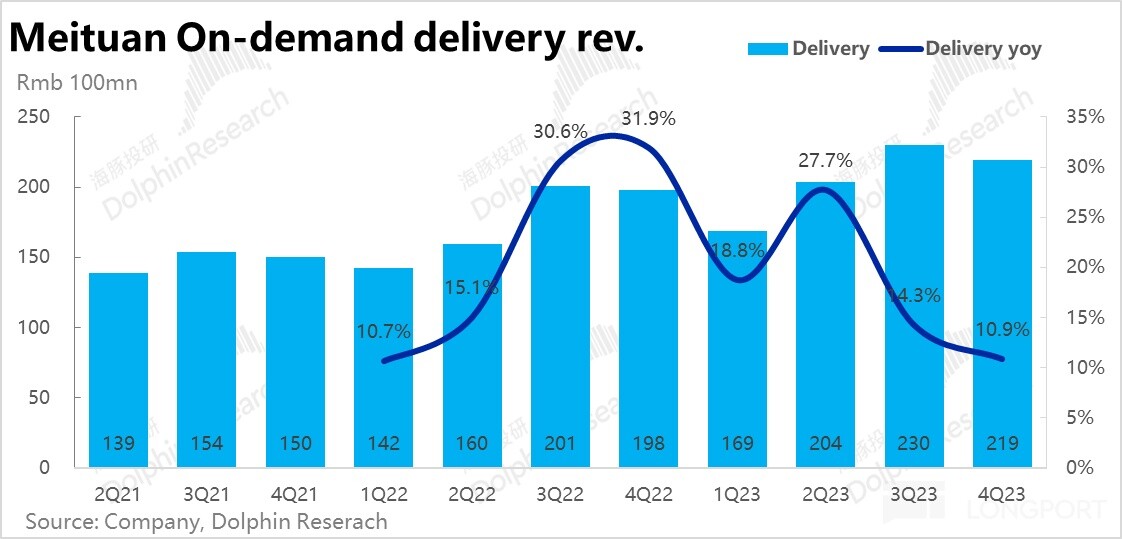 结合行业数据和华住、携程等酒旅公司的表现,国内文旅消费景气度四季环比上季是有一定程度下滑的。且出于抖音的竞争,到店板块本是市场先前最担忧的问题之一。不过实际上,本季广告收入为 109 亿,比预期高约 9%。同比增速 40.8%,和文旅景气度接近的二季度 40.4% 大体一致。换言之,在到店广告上,看起来美团的竞争格局至少是没再进一步恶化,甚至可能已边际有所改善。