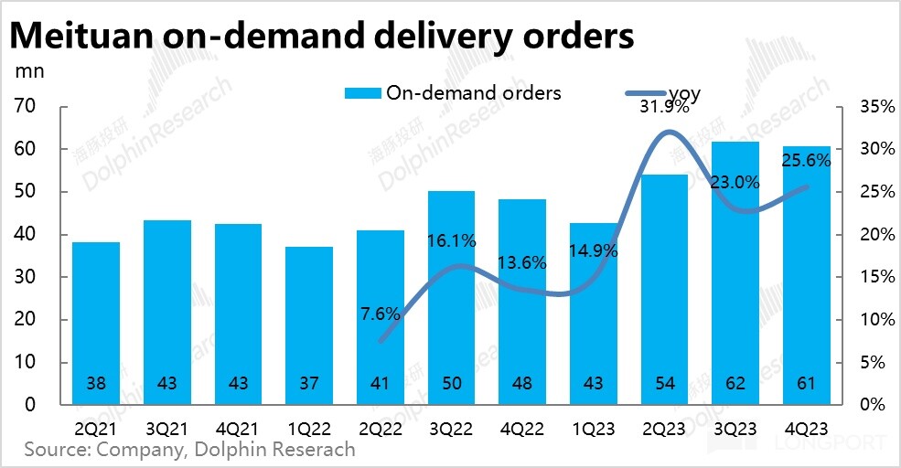 先看主要反映到家业务(餐饮外卖和闪购)表现的配送业务情况,四季度即配总单量约 61 亿单,日均约 6590 万单,和市场预期的 60 亿大体一致。公司曾表示本季单量的两年复合增速大致和先前一致,据我们测算本季复合增速为 19.4%,而上季为 19.5%。