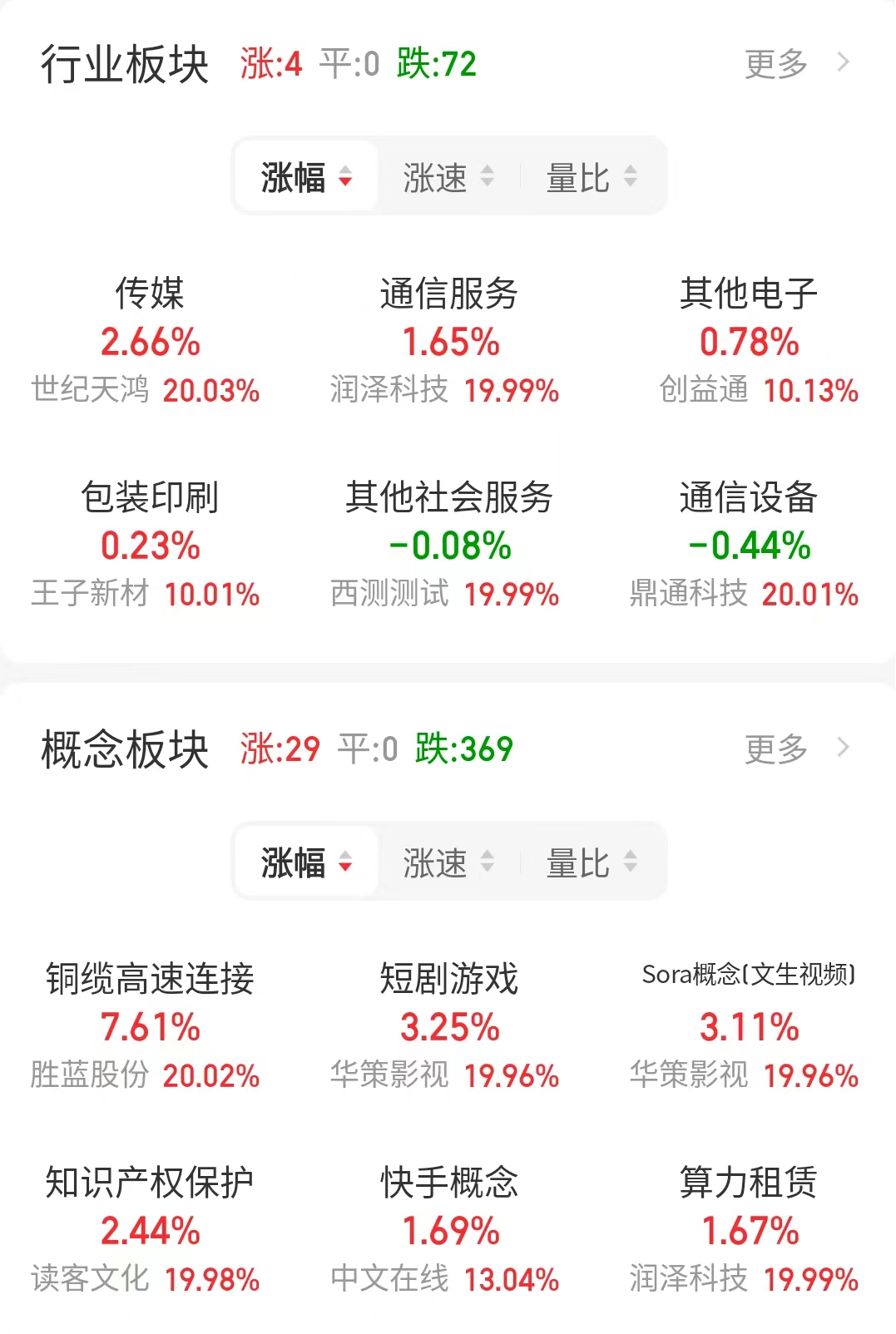 昨日领涨的行业板块是传媒、通信服务和其他电子,领涨的概念板块是铜缆高速连接、短剧游戏、Sora概念和知识产权保护概念。