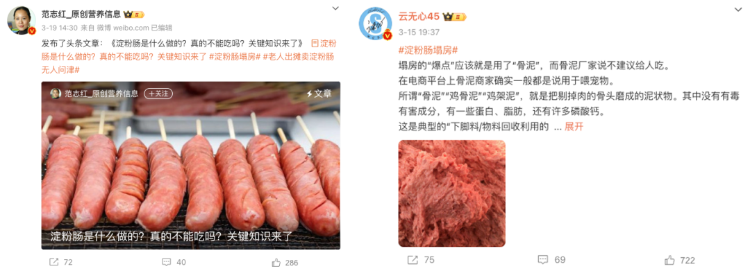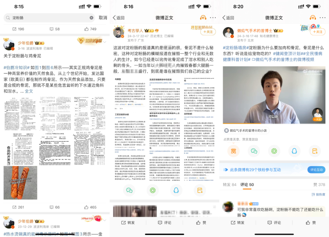 但事件发酵了一两天后,“淀粉肠事件”却迎来“话风”反转。先是有关“淀粉肠中用骨肉泥不算违规”的理性讨论出现,随后食品健康专家、科普大V和媒体人从“行业标准”、“鸡骨泥科普”和“营养价值”等维度,创作深度内容消除“误解”。