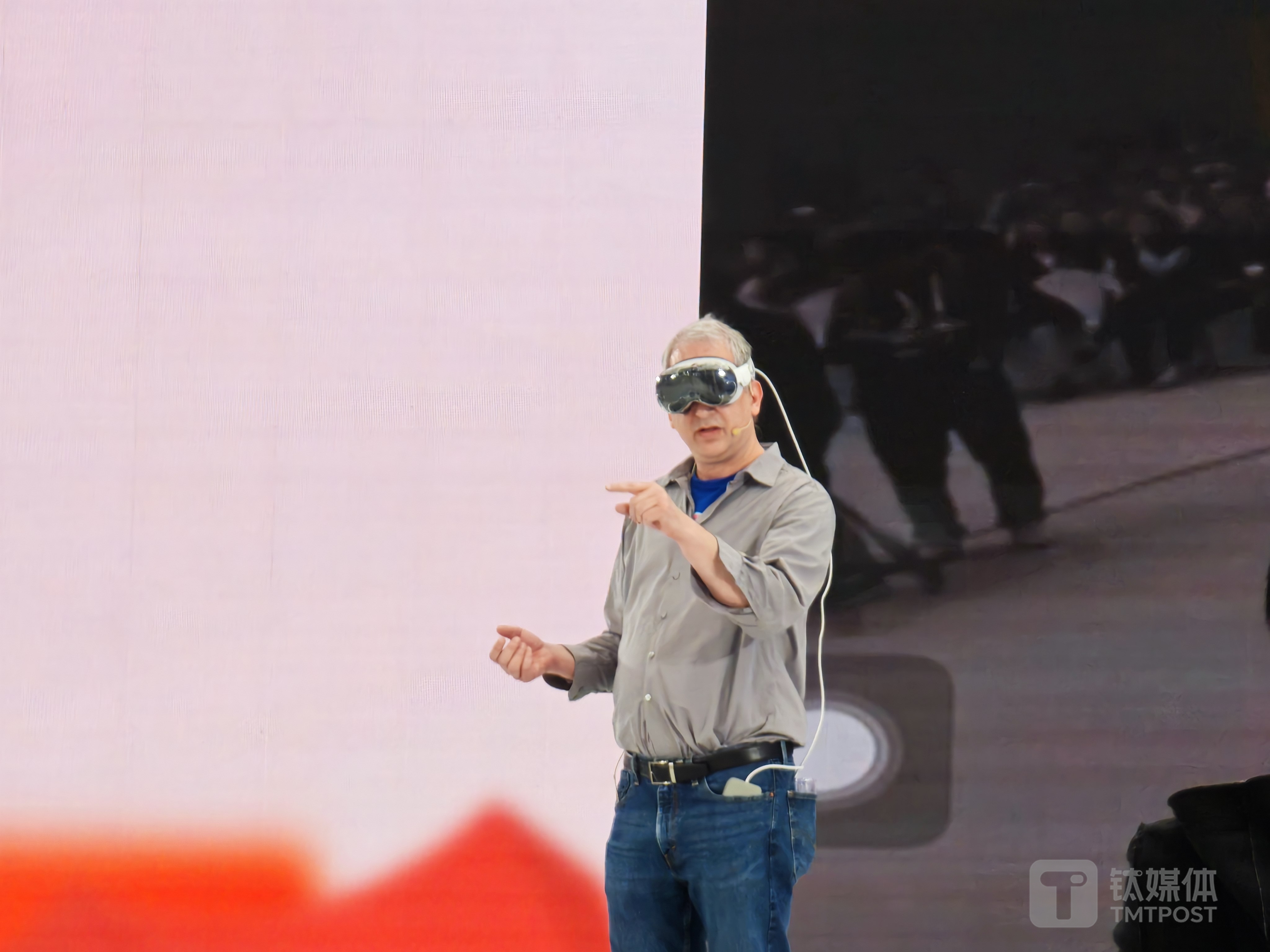 演讲开始的时候,“空间计算之父”、RealityPrime和XR Guild主席Avi Bar-Zeev戴上了苹果Vision Pro设备,展示了虚拟现实设备画面。