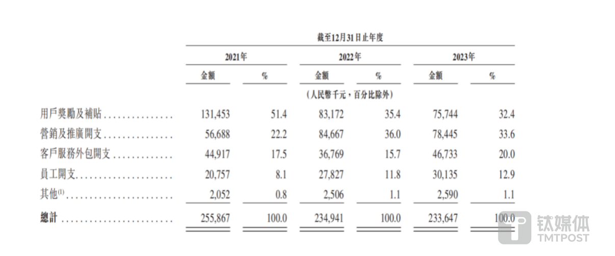 客单价上升的同时,嘀嗒出行对用户的奖励及补贴却在下滑。2021年,公司的用户奖励及补贴高达1.31亿元,占总销售费用的比例高达51.4%。随后,该项补贴出现下滑,到了2023年,用户奖励及补贴金额已经降低至7574万元。![]()