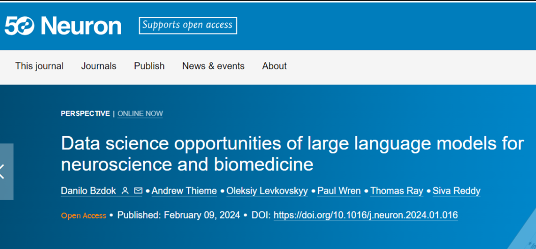 ▷ Bzdok, Danilo, et al. "Data science opportunities of large language models for neuroscience and biomedicine." Neuron (2024). https://doi.org/10.1016/j.neuron.2024.01.016