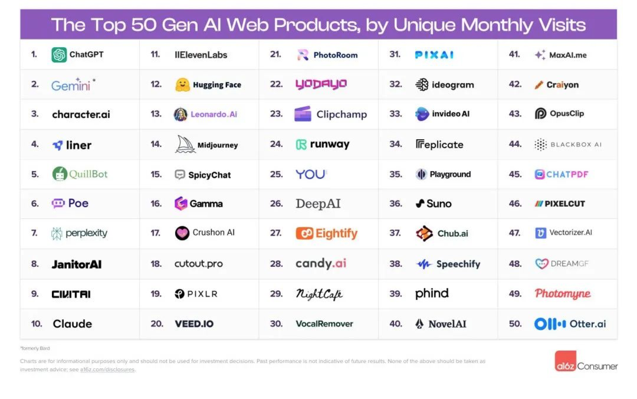 据风险投资公司a16z近期发布的《GenAI 消费应用 Top100 报告》显示,用户月访问量最大的应用网站中,类ChatGPT的效率助手占据了榜单前十的大壁江山,ChatGPT的每月网络访问量接近20亿次,第二名Gemini的每月访问量约为4亿次。