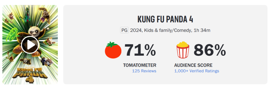 从口碑来看,《功夫熊猫4》的烂番茄新鲜度为71%,影评人称其“提供了足够引人注目的娱乐内容来维持年轻粉丝”,但也对该系列后续的开发潜力表示出一丝担忧;而《功夫熊猫4》的爆米花指数达到86%,可见观众的好感度依旧维持在高位。作为对比,《沙丘2》在烂番茄上的两项指标分别冲至93%和95%。在映后环节,《功夫熊猫4》的CinemaScore评分达到A-。
