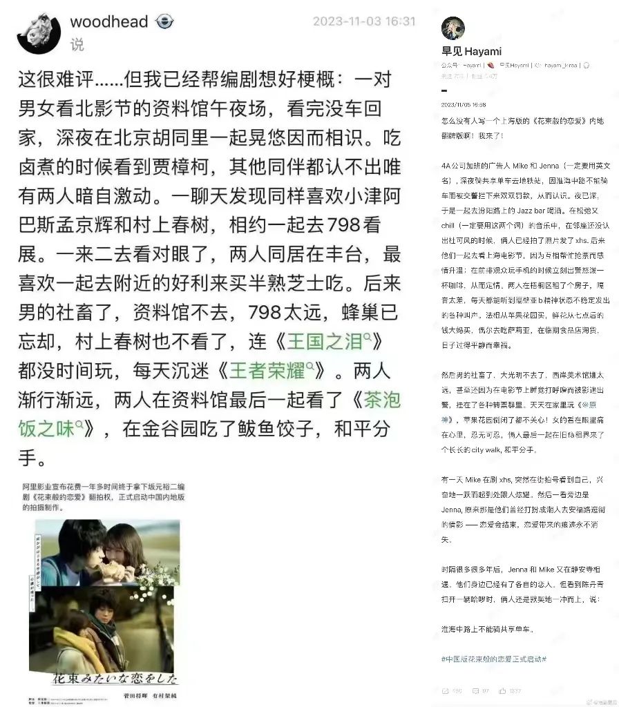 这样的案例数不胜数,本土化之后呈现的不伦不类最是观众集中吐槽的地方。比如《深夜食堂》强行复刻居酒屋,《外公芳龄38》复制韩版表演模式。这也是《花束般的恋爱》宣布翻拍后,引起网友一片质疑与嘘声的原因,原作故事里的日式文艺更加抽象细腻,网友们并不信任片方能完成好,于是,自发进行二创,写出各地版本的文青恋爱故事,提前提供本土化思路。