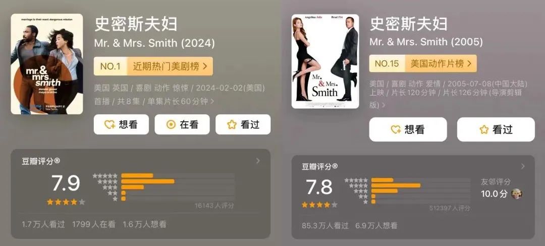 主创团队在原作的基础上,拓展故事深度,从电影体量扩充为电视剧,在原有的故事情节上,挖掘婚姻本质和生活症结,契合了当下观众情绪。翻拍后的《史密斯夫妇》,烂番茄指数90%,国内豆瓣评分也已经超过了原作。