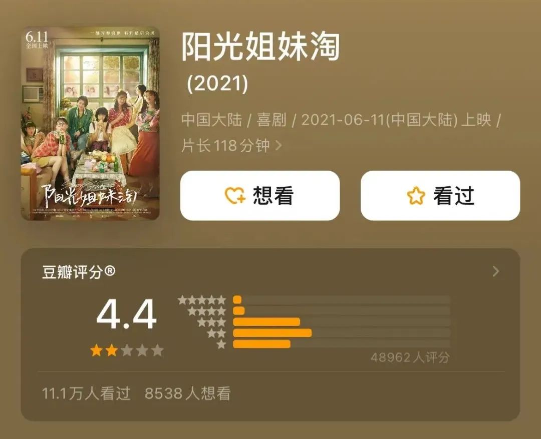 跨语境的叙事隔阂,让剧作层面稍微有一点偏差都会暴露出其创作的粗劣,比如《阳光姐妹淘》里韩国的“大姐大文化”安放在国内没有创造笑点和温情,反而有些奇怪,最终收获豆瓣4.4评分以及不足1亿的票房。