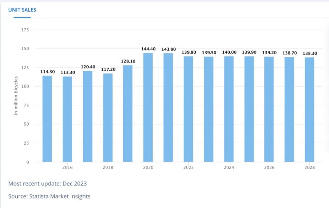 从销量上看,2020 年,全球自行车销量约为 1.44 亿。此后销量一路微跌,据 statista 预测,到 2028 年,全球自行车销量都难有重大突破。