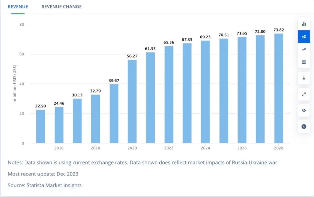 全球自行车市场规模变化(2015-2028)|来源:statista
